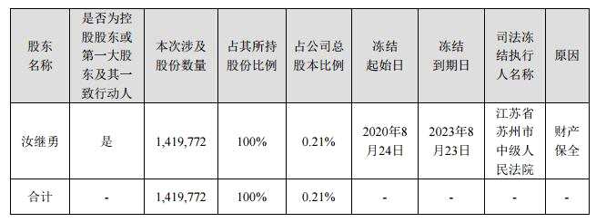 公告稱(chēng),汝繼勇本次被司法凍結(jié)所持有公司股份1419772股,占其所持股份比例100%,占公司總股本0.21%。對(duì)于股份被凍結(jié)的原因,德?tīng)栁磥?lái)表示因?qū)嶋H控制人汝繼勇先生與伊犁蘇新投資基金合伙企業(yè)(有限合伙)合同糾紛一案,伊犁蘇新向南京仲裁委員會(huì)申請(qǐng)仲裁,根據(jù)申請(qǐng)人伊犁蘇新及南京仲裁委員會(huì)的財(cái)產(chǎn)保全申請(qǐng),蘇州市中級(jí)人民法院凍結(jié)了汝繼勇先生持有本公司 1,419,772 股的股票。