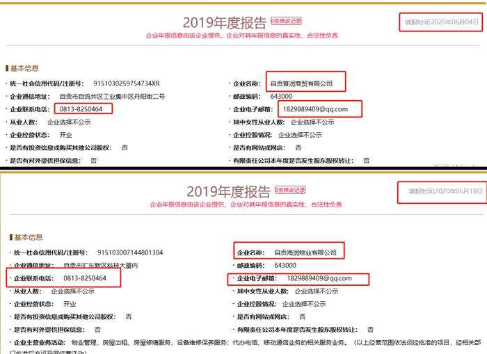 記者發(fā)現(xiàn),目前一家名為自貢海潤物業(yè)的公司(下稱自貢海潤)與普潤商貿(mào)在彼此的工商登記資料中使用相同的聯(lián)系方式,目前兩者共用一個電話和同一個工商登記聯(lián)系人郵箱。