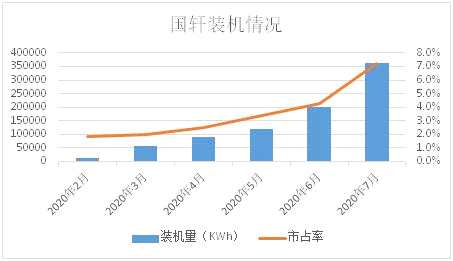 2020年7月,國軒高科裝機(jī)量達(dá)364MWh,環(huán)比增加81.7%,這也是國軒高科年內(nèi)第五個月實(shí)現(xiàn)月度裝機(jī)量環(huán)比提升,使得公司成為疫情爆發(fā)以來,行業(yè)裝機(jī)前20名中唯一保持五個月連續(xù)增長的企業(yè)。