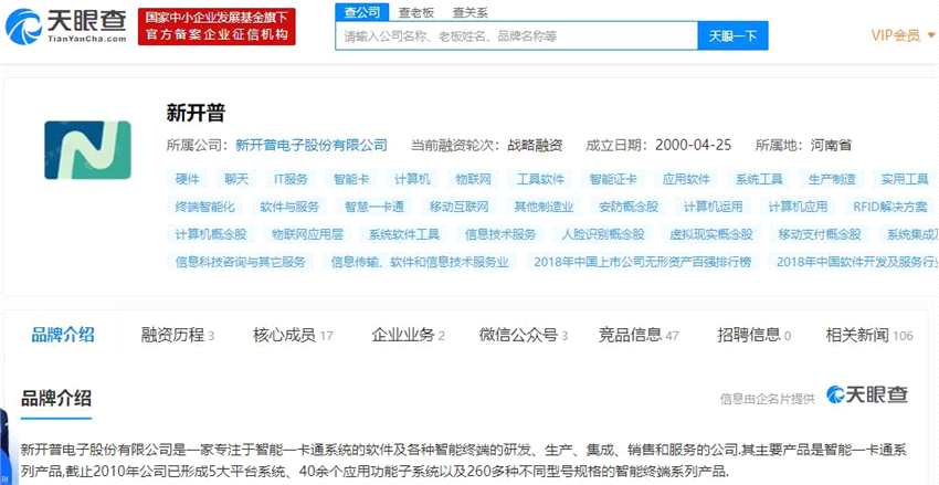 天眼查APP顯示,新開普電子股份有限公司是一家專注于智能一卡通系統(tǒng)的軟件及各種智能終端的研發(fā)、生產(chǎn)、集成、銷售和服務(wù)的公司.其主要產(chǎn)品是智能一卡通系列產(chǎn)品,截止2010年公司已形成5大平臺(tái)系統(tǒng)、40余個(gè)應(yīng)用功能子系統(tǒng)以及260多種不同型號(hào)規(guī)格的智能終端系列產(chǎn)品。
