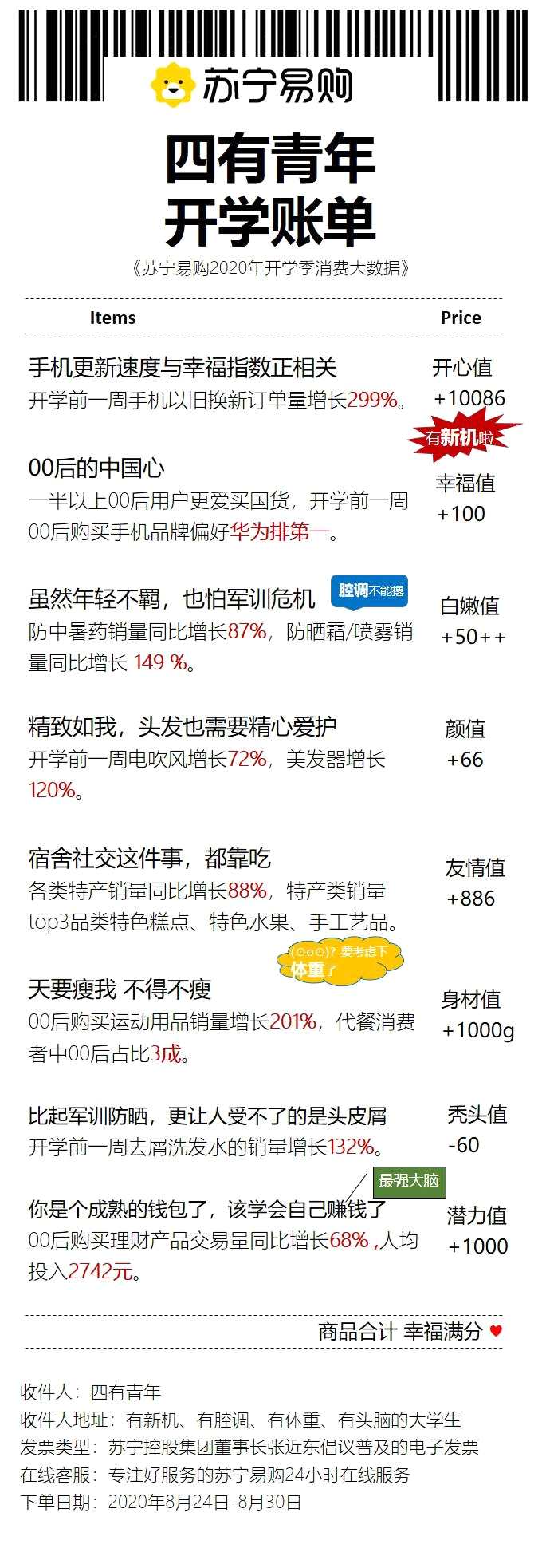 隨著開(kāi)學(xué)季到來(lái),各電商平臺(tái)也迎來(lái)了學(xué)生“消費(fèi)季”,蘇寧易購(gòu)(002024)發(fā)布2020年開(kāi)學(xué)季消費(fèi)大數(shù)據(jù)顯示,高校學(xué)生爭(zhēng)做有新機(jī)、有腔調(diào)、有體重、有頭腦的“四有青年”,換手機(jī)、買(mǎi)防曬、減體重、存點(diǎn)錢(qián)成了他們的當(dāng)務(wù)之急。
