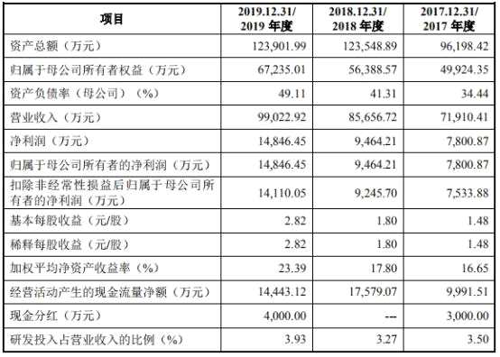 2019年,瑞聯(lián)新材實(shí)現(xiàn)營(yíng)業(yè)收入9.90億元,同比增長(zhǎng)15.60%;歸屬于母公司所有者的凈利潤(rùn)1.48億元,同比增長(zhǎng)56.87%;扣除非經(jīng)常性損益后的歸屬于母公司所有者的凈利潤(rùn)1.41億元,同比增長(zhǎng)52.61%;經(jīng)營(yíng)活動(dòng)產(chǎn)生的現(xiàn)金流量?jī)纛~1.44億元,同比下降17.84%。