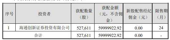 據(jù)瑞聯(lián)新材上市發(fā)行結(jié)果公告顯示,瑞聯(lián)新材跟投機(jī)構(gòu)為海通創(chuàng)新證券投資有限公司,最終戰(zhàn)略配售數(shù)量為52.76萬(wàn)股,跟投金額為6000萬(wàn)元,占發(fā)行總量的3.01%,限售期為24個(gè)月。