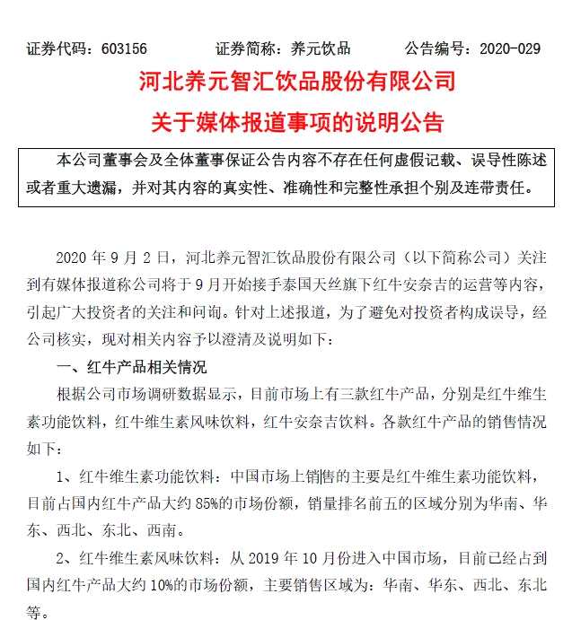 養(yǎng)元飲品釋疑:孫公司與泰國(guó)天絲合作 經(jīng)銷長(zhǎng)江以北紅牛安奈吉