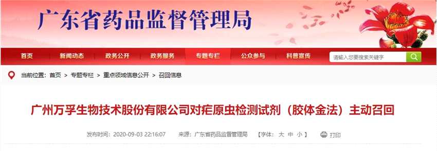 訊 (記者 陳娟女) 據(jù)廣東省藥品監(jiān)督管理局網(wǎng)站2020年9月3日消息,廣州萬孚生物(300482)技術(shù)股份有限公司報告,發(fā)現(xiàn)部分批次瘧原蟲檢測試劑(膠體金法)產(chǎn)品技術(shù)表述與國家參考品的要求存在偏差。廣州萬孚生物技術(shù)股份有限公司對其生產(chǎn)的瘧原蟲檢測試劑(膠體金法)(注冊證號:國械注準(zhǔn)20153400610)主動召回。召回級別為 三級 。