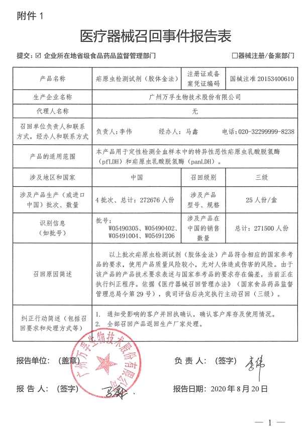 廣州萬孚生物技術(shù)股份有限公司對瘧原蟲檢測試劑(膠體金法)主動召回