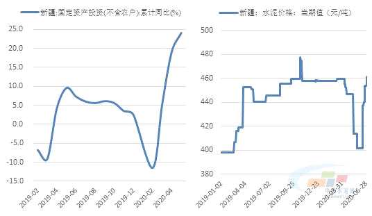 圖3、4:新疆固定資產(chǎn)投資累計同比與新疆地區(qū)水泥參考價格