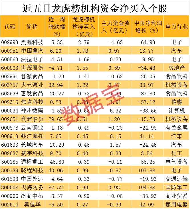 證券時(shí)報(bào) 數(shù)據(jù)寶統(tǒng)計(jì),近五個(gè)交易日(9月1日至9月7日)的龍虎榜當(dāng)中,80只個(gè)股出現(xiàn)了機(jī)構(gòu)的身影,其中45只股票呈現(xiàn)機(jī)構(gòu)凈買入,35只股票呈現(xiàn)機(jī)構(gòu)凈賣出。機(jī)構(gòu)凈買入額超億元的個(gè)股共6只,奧??萍?行情002993,診股)、【中國(guó)重汽(000951)、股吧】(行情000951,診股)、法拉電子(行情600563,診股)獲機(jī)構(gòu)凈買入額分別為2.79億元、1.78億元、1.69億元,其中奧??萍肌⒎ɡ娮泳鶎匐娮有袠I(yè)。