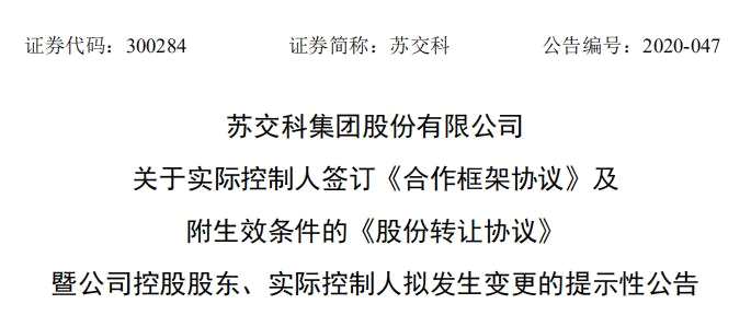 近期,蘇交科(300284)(全稱:蘇交科集團股份有限公司)在停牌 5 個交易日后,于 8 月 22 日發(fā)布公告稱,公司實際控制人符冠華、王軍華與廣州珠江實業(yè)(600684)集團及其一致行動人廣州國發(fā)基金簽署《合作框架協(xié)議》及附生效條件的《股份轉(zhuǎn)讓協(xié)議》。同時,蘇交科與廣州珠江實業(yè)集團簽署附生效條件的《股份認購協(xié)議》。上述一系列協(xié)議生效并實施完成后,公司控股股東將變更為廣州珠江實業(yè)集團,實際控制人將變更為廣州市國資委。