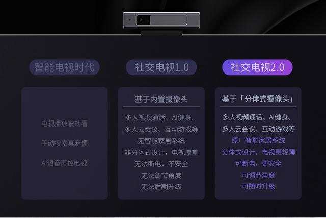 更重要的是,攝像頭支持后期升級(jí)!即使電視用上三五年,但只需要進(jìn)行升級(jí)即可時(shí)刻get最新款,使用體驗(yàn)感更加。此外,"分體式攝像頭"在安全方面也有一定的提升,畢竟可以單獨(dú)對(duì)攝像頭進(jìn)行斷電,更好保護(hù)家庭內(nèi)部的隱私。