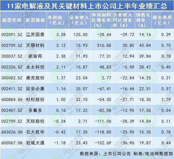 11家電解液及其關(guān)鍵材料上市公司上半年業(yè)績匯總