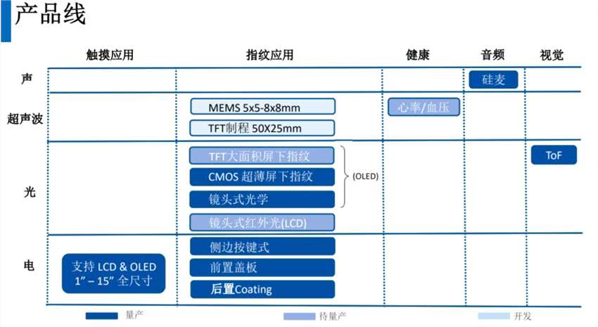 產(chǎn)品現(xiàn)狀方面,兆易創(chuàng)新在2019年將思立微歸置麾下,其芯片發(fā)展方向都是圍繞聲、光、電這三個方向來進行的,耕耘最多的是電容式指紋識別、光學式指紋識別,包括超薄的、鏡頭式的、以及即將量產(chǎn)的TFT大面積光學識別,此外還有超聲波指紋、硅麥產(chǎn)品。目前其觸控和指紋產(chǎn)品廣泛應用于國內(nèi)外知名的移動終端廠商,是全球唯一能提供包括電容、光學、大面積、超聲等最全指紋方案的供應商。