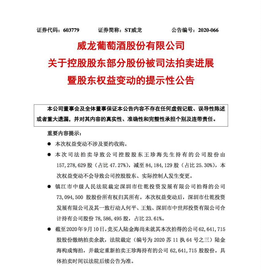 此前,ST威龍?jiān)l(fā)布公告稱,公司控股股東、實(shí)際控制人王珍海因涉及借款合同糾紛一事,所持有的公司1.36億股股份已通過淘寶網(wǎng)司法拍賣網(wǎng)絡(luò)平臺(tái)競(jìng)價(jià)拍賣成交。分別由深圳市仕乾投資發(fā)展有限公司和自然人陸金海競(jìng)得,其中陸金海拍的王珍海持有的公司6264.1715萬股股份,占其持有公司股份的39.83%,占公司總股本的18.81%,成交價(jià)為4.19億元。