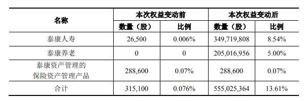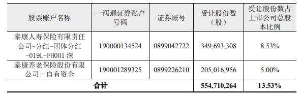 在協(xié)議中,泰康人壽受讓8.53%的股份、共計3.50億股,泰康養(yǎng)老受讓5.00%的股份、共計2.05億股。二者合計受讓5.55億股,占公司總股本的13.53%。