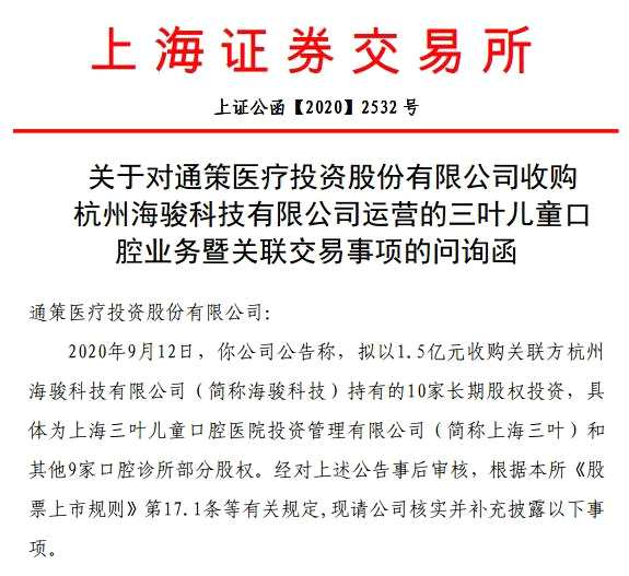 近日,通策醫(yī)療(600763)公告的一份關(guān)于收購實控人資產(chǎn)引來了各方面的質(zhì)疑。9月14日,上交所下發(fā)了關(guān)于對通策醫(yī)療投資股份有限公司收購杭州海駿科技有限公司運營的三葉兒童口腔業(yè)務(wù)暨關(guān)聯(lián)交易事項的問詢函,對估值合理性、交易必要性進(jìn)行問詢。