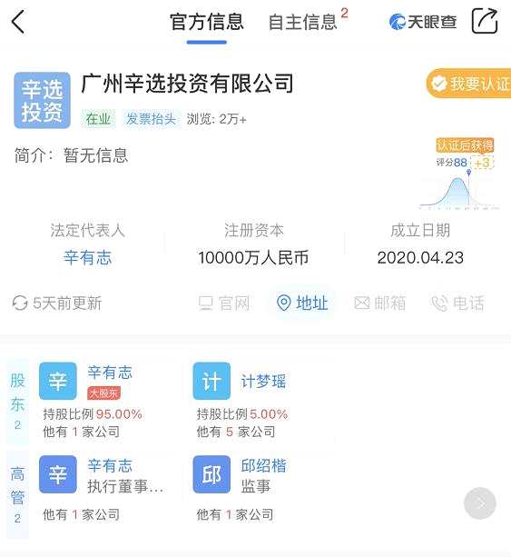 天眼查資料顯示,辛選投資分別由辛有志和計(jì)夢瑤持有95%和5%的股份,其中辛有志擔(dān)任辛選投資執(zhí)行董事、總經(jīng)理和法定代表人。