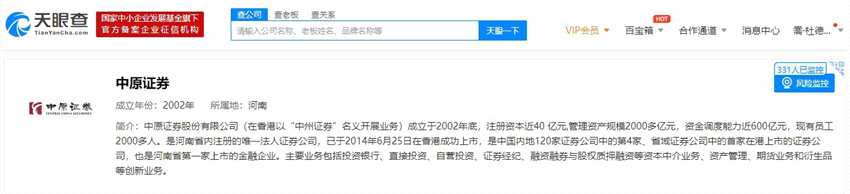 天眼查APP顯示,中原證券成立于2002年底,注冊(cè)資本近40 億元,管理資產(chǎn)規(guī)模2000多億元,資金調(diào)度能力近600億元,現(xiàn)有員工2000多人。