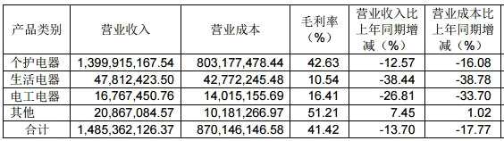 細(xì)分來(lái)看,2020年上半年飛科電器的個(gè)人護(hù)理電器、生活電器和電工電器分別實(shí)現(xiàn)營(yíng)收13.9億元、4781.24萬(wàn)元、1676.74萬(wàn)元。其中,個(gè)人護(hù)理電器營(yíng)收同比下滑12.57%,生活電器營(yíng)收同比下滑38.44%、電工電器營(yíng)收同比下滑26.81%。
