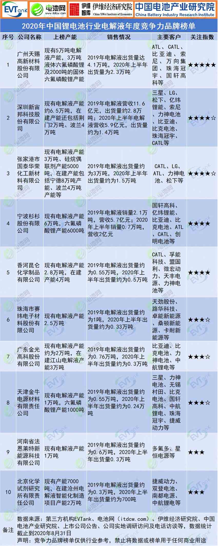2020年中國鋰電池行業(yè)電解液年度競爭力品牌榜單廣州天賜高新材料股份有限公司、深圳新宙邦(300037)科技股份有限公司、張家港市國泰華榮化工新材料有限公司、寧波杉杉股份(600884)有限公司、香河昆侖化學(xué)制品有限公司、珠海市賽緯電子材料股份有限公司、廣東金光高科股份有限公司、天津金牛電源材料有限責(zé)任公司、河南省法恩萊特新能源科技有限公司、北京化學(xué)試劑研究所有限責(zé)任公司十家企業(yè)上榜。(來源:電池網(wǎng)-EVTank)