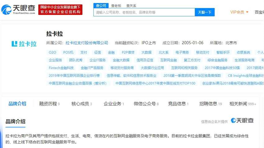 天眼查APP顯示,拉卡拉為商戶及其用戶提供包括支付、生活、電商、信貸在內的互聯(lián)網金融服務及電子商務服務。目前的拉卡拉金服集團,已經發(fā)展成為綜合性的、線上線下結合的互聯(lián)網金融服務平臺。