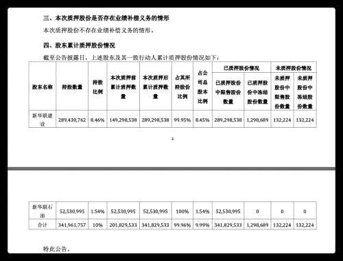 本次新華聯(lián)建設(shè)解質(zhì)押及質(zhì)押后,累計(jì)質(zhì)押股份數(shù)量(含本次)289,298,538股,占其持股數(shù)量比例99.95%,占總股本比例8.45%。新華聯(lián)建設(shè)及其一致行動(dòng)人新華聯(lián)石油累計(jì)質(zhì)押股份數(shù)341,829,533股,占其持股數(shù)量比例99.96%,占總股本比例為9.99%。
