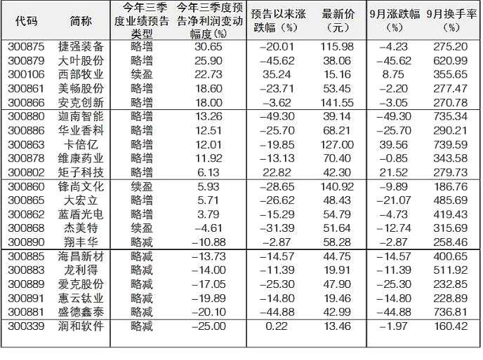 隨著季末臨近,上市公司三季報(bào)亦將浮出水面。根據(jù)Wind統(tǒng)計(jì),截至昨日,已有43家創(chuàng)業(yè)板公司披露三季報(bào)預(yù)告情況。從預(yù)告凈利變動(dòng)幅度來看,【康泰醫(yī)學(xué)(300869)、股吧】(行情300869,診股)、穩(wěn)健醫(yī)療(行情300888,診股)、康華生物(行情300841,診股)、金春股份(行情300877,診股)、華伍股份(行情300095,診股)、回盛生物(行情300871,診股)、樂心醫(yī)療(行情300562,診股)、長(zhǎng)盈精密(行情300115,診股)、中科創(chuàng)達(dá)(行情300496,診股)排名靠前。業(yè)內(nèi)人士認(rèn)為,隨著前期市場(chǎng)對(duì)創(chuàng)業(yè)板低價(jià)股的炒作降溫,未來績(jī)優(yōu)創(chuàng)業(yè)板公司值得關(guān)注。二級(jí)市場(chǎng)來看,自預(yù)告以來,西部牧業(yè)(行情300106,診股)、矩子科技(行情300802,診股)、佐力藥業(yè)(行情300181,診股)、樂心醫(yī)療、康華生物漲幅超過15%。