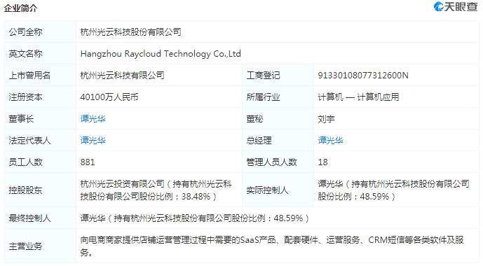 天眼查APP顯示,杭州光云科技股份有限公司與2020年4月29日登陸科創(chuàng)板,公司主營業(yè)務(wù)為向電商商家提供店鋪運營管理過程中需要的SaaS產(chǎn)品、配套硬件、運營服務(wù)、CRM短信等各類軟件及服務(wù)。
