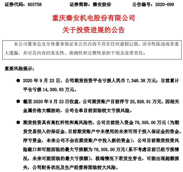 就在一天前,9月23日晚間,秦安股份發(fā)布了今年首份期貨投資平倉虧損公告。秦安股份在公告中表示,9月12日至22日,公司根據(jù)對已建倉期貨的后續(xù)價格走勢判斷,對前期建倉的期貨投資合約進行部分平倉,平倉虧損6952.55萬元,占公司2019年度經(jīng)審計凈利潤的58.93%,平倉虧損將計入公司2020年度損益。