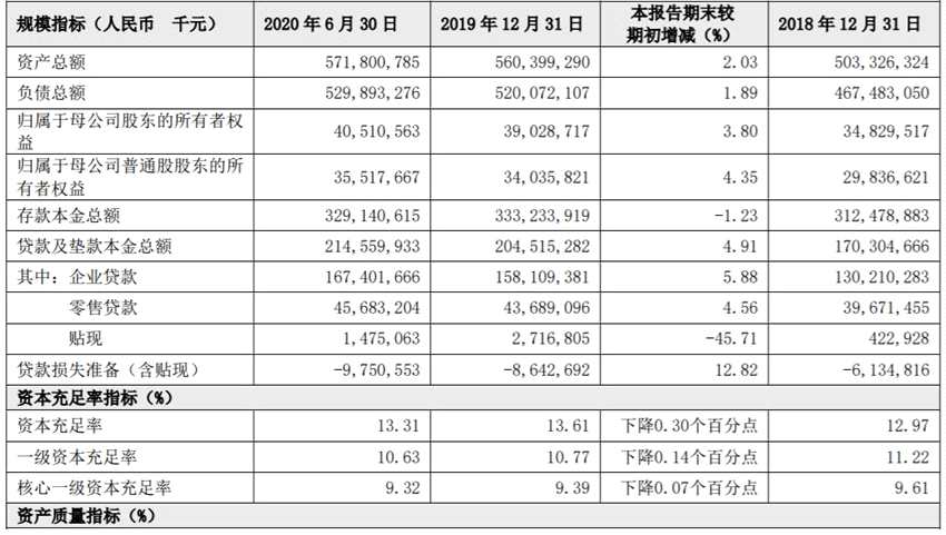 根據(jù)貴陽(yáng)銀行2020中報(bào)顯示,上半該行資產(chǎn)總額為5718.01 億元,較年初增加114.01億元,增長(zhǎng)2.03%;存款余額3291.41 億元,較年初減少40.93億元,下降1.23%;貸款余額 2145.60 億元,較年初增加 100.45 億元,增長(zhǎng) 4.91%。