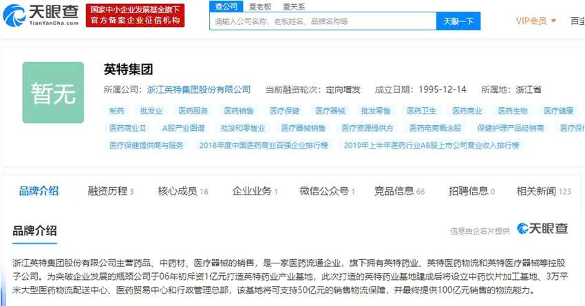 天眼查APP顯示,浙江英特集團(tuán)股份有限公司主營(yíng)藥品、中藥材、醫(yī)療器械的銷售,是一家醫(yī)藥流通企業(yè),旗下?lián)碛杏⑻厮帢I(yè)、英特醫(yī)藥物流和英特醫(yī)療器械等控股子公司。