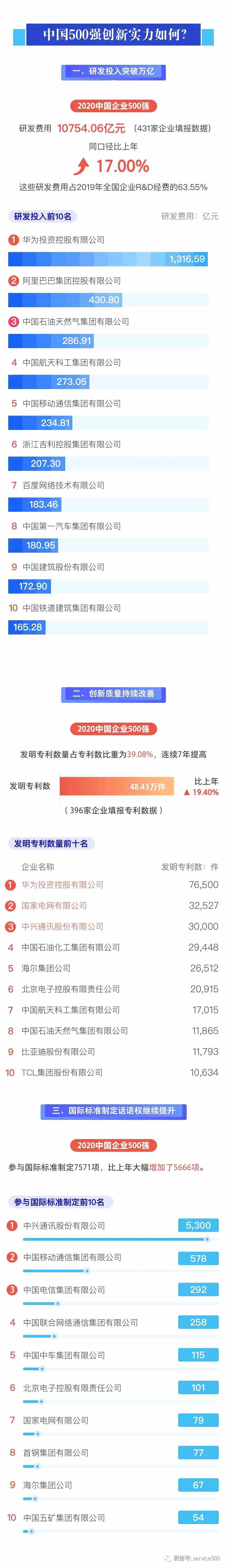 三是研發(fā)創(chuàng)新成效明顯。2020中國企業(yè)500強(qiáng)研發(fā)投入保持持續(xù)增加態(tài)勢,研發(fā)強(qiáng)度維持在1.61%,達(dá)到歷史最高值水平;發(fā)明專利占全部專利的比重為39.08%,比上年500強(qiáng)提高了2.47個百分點(diǎn)。