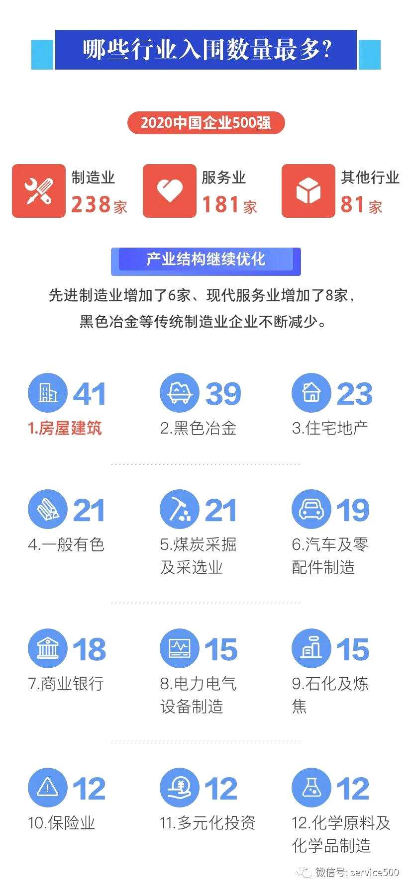 二是結(jié)構(gòu)調(diào)整繼續(xù)深化。2020中國企業(yè)500強(qiáng)中先進(jìn)制造業(yè)和現(xiàn)代服務(wù)業(yè)企業(yè)數(shù)量分別增加了6家和8家,而傳統(tǒng)制造業(yè)企業(yè)有所減少。