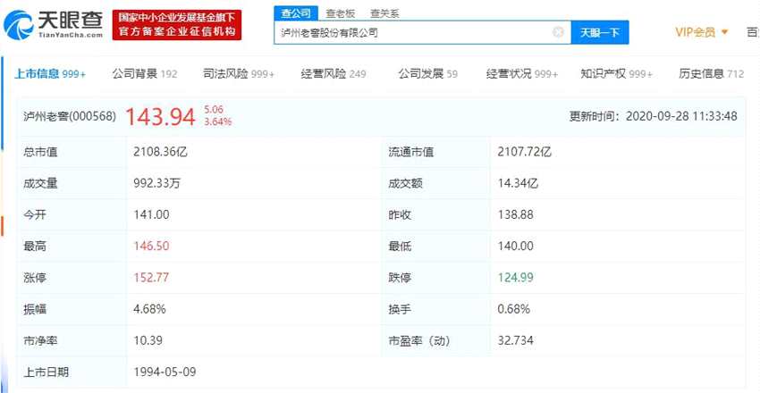 受此利好帶動(dòng),瀘州老窖早盤走高,截止發(fā)稿,天眼查APP顯示,二級(jí)市場(chǎng)上股價(jià)漲幅達(dá)到3.64%。