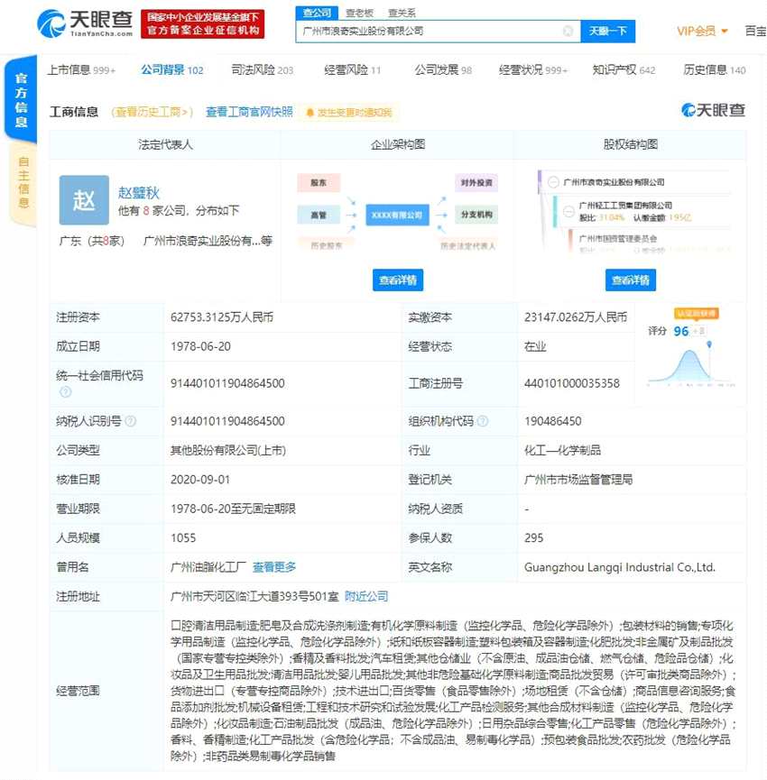 廣州市浪奇實(shí)業(yè)股份有限公司成立于1978年6月,注冊(cè)資本約6.3億人民幣,法定代表人為趙璧秋,公司經(jīng)營(yíng)范圍包括:口腔清潔用品制造;肥皂及合成洗滌劑制造;有機(jī)化學(xué)原料制造(監(jiān)控化學(xué)品、危險(xiǎn)化學(xué)品除外);香精及香料批發(fā);汽車租賃;其他倉(cāng)儲(chǔ)業(yè)等。天眼查App十大股東信息顯示,該公司第一大股東為廣州輕工工貿(mào)集團(tuán)有限公司,持股比例為31.04%,第二大股東為廣州國(guó)資發(fā)展控股有限公司,持股比例14.22%。