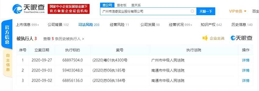 摘要: 天眼查APP顯示,近日,廣州市浪奇實(shí)業(yè)股份有限公司新增一條被執(zhí)行人信息,立案日期為2020年9月27日,執(zhí)行法院為廣州市中級(jí)人民法院,執(zhí)行標(biāo)的超6800萬(wàn),案號(hào)為(2020)粵01執(zhí)4300號(hào)。