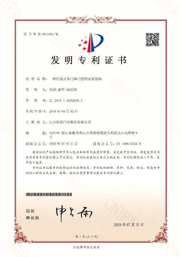 專心專注成就專業(yè)專家:江山歐派再獲一項發(fā)明專利證書