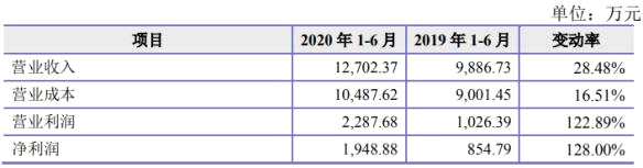 2020年1-6月,公司實(shí)現(xiàn)營(yíng)業(yè)收入1.27億元,較去年同期增長(zhǎng)28.48%;凈利潤(rùn)1948.88萬(wàn)元,較去年同期增長(zhǎng)128%;經(jīng)營(yíng)活動(dòng)產(chǎn)生的現(xiàn)金流量?jī)纛~-4797.47萬(wàn)元,同比增長(zhǎng)115.21%。