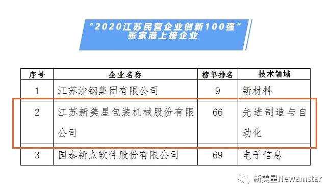 日前,江蘇省工商聯(lián)與江蘇省科學(xué)技術(shù)發(fā)展戰(zhàn)略研究院首次聯(lián)合發(fā)布江蘇民營企業(yè)創(chuàng)新100強(qiáng)。新美星(300509)憑借在先進(jìn)制造與自動(dòng)化領(lǐng)域的創(chuàng)新實(shí)力和突出貢獻(xiàn),榮登“2020江蘇民營企業(yè)創(chuàng)新100強(qiáng)”榜單。