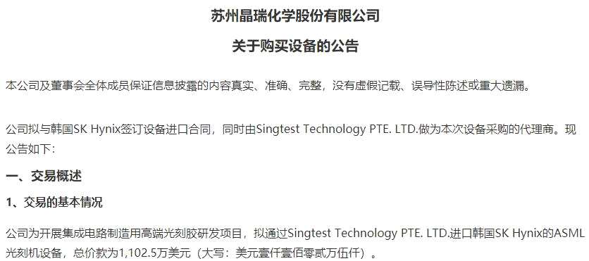 9月28日晚間,晶瑞股份(300655)公告稱,為開展集成電路制造用高端光刻膠研發(fā)項(xiàng)目,擬通過(guò)Singtest Technology PTE. LTD.進(jìn)口韓國(guó)SK Hynix(海力士)的ASML光刻機(jī)設(shè)備, 總價(jià)款為1102.5萬(wàn)美元(折合7508萬(wàn)人民幣)。