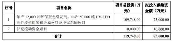募集說明書顯示,強力新材本次擬募資不超過8.5億元。其中,7.5億元將用于“年產(chǎn)12,000噸環(huán)保型光引發(fā)劑、年產(chǎn)50,000噸UV-LED高性能樹脂等相關(guān)原材料及中試車間項目”;1億元將用于“補充流動資金項目”。