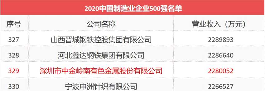 中金嶺南連續(xù)16年入選中國制造業(yè)企業(yè)500強(qiáng) 2020年位列第329位