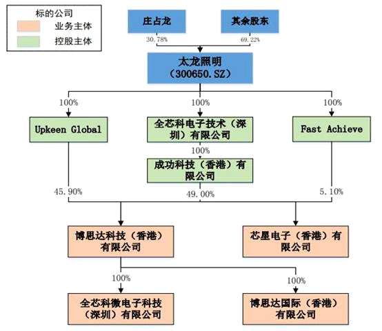 早在5月份,太龍照明發(fā)布公告稱,擬以支付現(xiàn)金方式收購(gòu)全芯科、Upkeen Global和Fast Achieve的100%股權(quán),本次交易標(biāo)的持有的主要資產(chǎn)為博思達(dá)科技(香港)有限公司和芯星電子(香港)有限公司的100%股權(quán)。