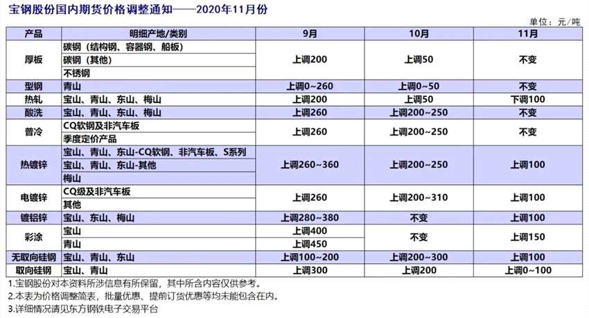 經(jīng)研究決定,寶鋼股份(600019)碳鋼內(nèi)銷(xiāo)價(jià)格2020年11月份在10月份基礎(chǔ)上調(diào)整公告如下(以下除特殊注明外,均為不含稅):