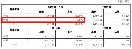 而中國地區(qū)的銷售額從2017年的257萬元增長至2018年的1332萬元后,2019年突然縮減至177萬元,今年上半年更是驟降為0。