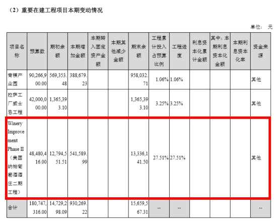 在大幅虧損的情況下,青青稞酒半年報顯示,在建工程中,美國納帕葡萄酒酒莊二期工程賬面余額為1334萬元,占比73%。