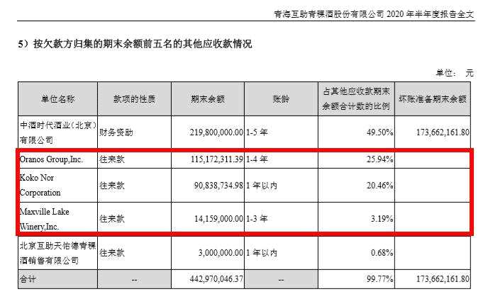 同時,其他應收款中,OG等三家境外公司合計欠款2.2億元,接近青青稞酒上半年營收的63%。