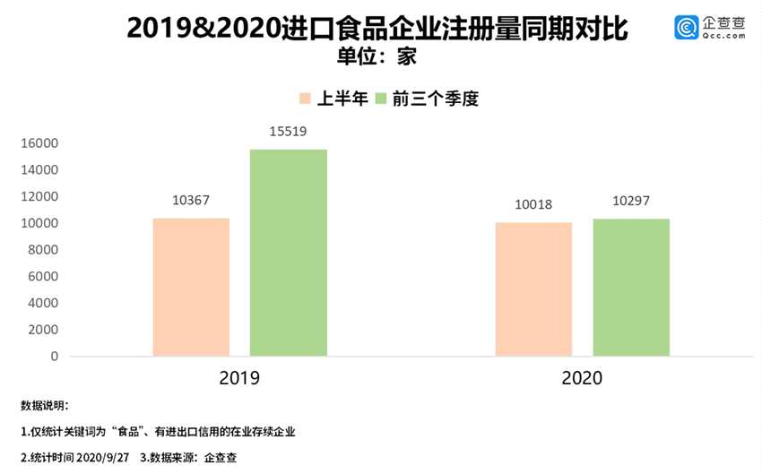 企查查數(shù)據(jù)顯示,今年前三個(gè)季度,我國(guó)進(jìn)口食品相關(guān)企業(yè)的注冊(cè)量是1.03家,同比下跌了33.3%。其中,上半年(1-6月)新增企業(yè)1.0萬(wàn)家,與去年同期基本持平。