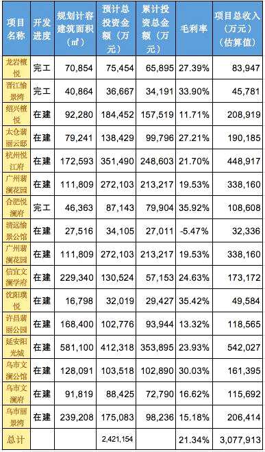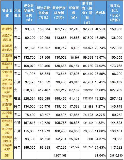 這16個(gè)項(xiàng)目中,毛利率超過26%的項(xiàng)目,只有鄭州麗景公館和景德鎮(zhèn)翡麗公園兩個(gè)項(xiàng)目。合并計(jì)算這16個(gè)項(xiàng)目,整體毛利率只為21.64%。
