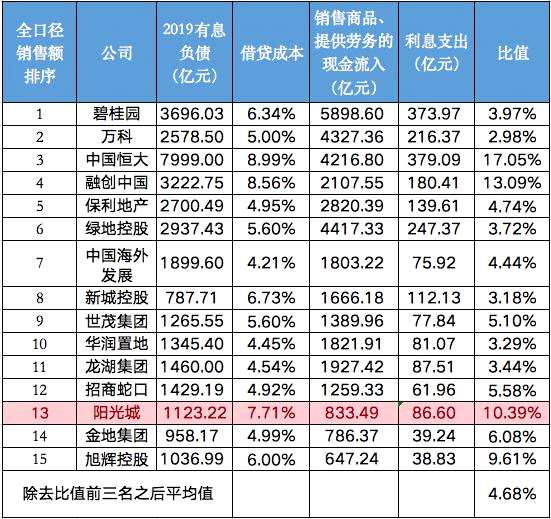 今天我們要研究的,是“地產(chǎn)銷售十五強(qiáng)”(下稱“十五強(qiáng)”)中的另一家上市公司――陽光城集團(tuán)股份有限公司(000671. SZ,下稱“陽光城”)。發(fā)現(xiàn),陽光城2019年的利息支出與銷售現(xiàn)金流入的比值為10.39%,在“十五強(qiáng)”中債務(wù)負(fù)擔(dān)僅次于中國恒大和融創(chuàng)中國(01918.HK),排在第三。