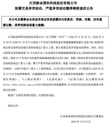 10月11日下午,新余國科發(fā)布公告稱,公司2020年9月29日、2020年9月30日、2020年10月9日連續(xù)3個交易日股票收盤價格漲幅偏離值累計達(dá)到30%,公司目前正在核查中,公司股票自2020年10月12日開市起停牌核查,自披露核查公告后復(fù)牌。